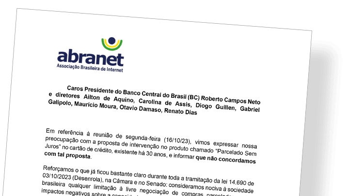 Entidade encaminha carta aberta ao Banco Central onde pontua:a plena competição tem de valer e lembra que as compras parceladas são o motor do consumo no Brasil. A Abranet sustenta que não há razão lógica para a Febraban insistir em querer limitar o parcelamento sem juros.