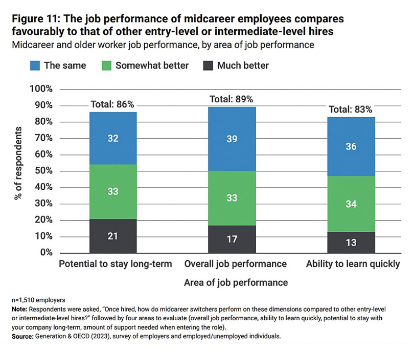 De acordo com a pesquisa “Age-Proofing AI”, da Generation, trabalhadores mais experientes têm um desempenho tão bom, se não melhor, do que seus colegas mais jovens. Esses dados contradizem a suposição de que os profissionais mais velhos não são bons com ferramentas tecnológicas. Mais: eles têm muito a contribuir no aspecto comportamental e sócio emocional no trabalho.