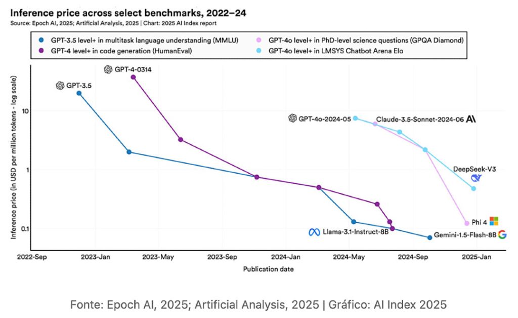 • Custo de uso. Os custos de hardware estão diminuindo, o desempenho do hardware está aumentando e a eficiência energética está aumentando. Isso significa que os custos de inferência, ou a despesa de consultar um modelo treinado, estão caindo drasticamente.  Dependendo da tarefa, os preços de inferência LLM caíram de 9 a 900 vezes por ano. O custo de consultar um modelo de IA que pontua o equivalente a GPT-3.5 (64,8% de precisão) no MMLU caiu de US$ 20 por milhão de tokens em novembro de 2022 para apenas US$ 0,07 por milhão de tokens em outubro de 2024 (Gemini-1.5-Flash-8B) – uma redução de mais de 280 vezes em aproximadamente 18 meses.