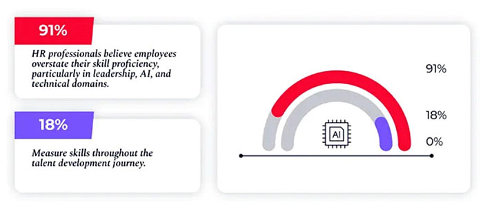 - 91% dos profissionais de RH acreditam que seus colaboradores superestimam suas próprias habilidades, especialmente em liderança, IA e competências técnicas.