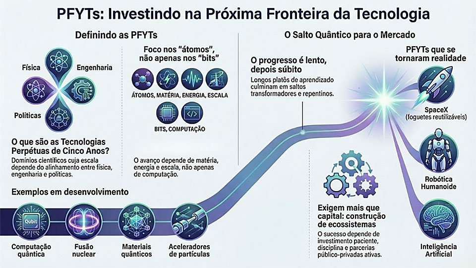 No entanto, essas mesmas tecnologias são as que têm o maior potencial de transformação do século XXI. O fundo de venture capital Quantonation sabe bem o valor escondido nesse “limbo tecnológico”. Eles investem em startups globais early-stage focadas nos avanços da Física e da computação. Recentemente, resolveram explicar sua tese no paper “Investing in Perpetual Five-Year Technologies (PFYTs)“. As PFYTs são tecnologias que orbitam esse horizonte móvel não por falta de ciência, mas pela complexidade de escalar a Física no mundo real. São sistemas cuja entrada para o mundo comercial depende de um alinhamento entre avanços científicos, maturidade industrial, novas cadeias de suprimentos, políticas públicas adequadas e capital paciente. As PFYTs, aponta o documento, não são ficção científica, nem atraso científico, nem hype. Elas representam a próxima fronteira industrial.