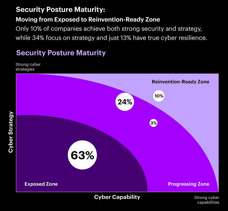 Segundo a Accenture, somente 34% das organizações possuem uma estratégia madura de cibersegurança, e meros 13% contam com capacidades avançadas para enfrentar ameaças complexas. Isso deixa a maioria das empresas no que a Accenture chama de “Exposed Zone”, vulnerável a ataques sofisticados. Além disso: