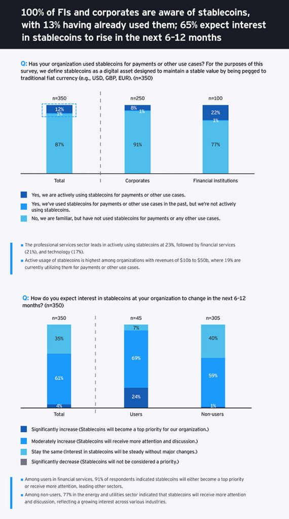 As stablecoins são utilizadas por 13% das instituições financeiras e empresas em todo o mundo, com instituições financeiras (23%) liderando as empresas (9%) na adoção inicial. Pelo menos 54% dos não usuários preveem a adoção de stablecoins nos próximos 6 a 12 meses, e 58% das empresas planejam adotá-las em até dois anos, de acordo com estudo da EY-Parthenon. Isso mostra que stablecoins estão se aproximando da adoção mainstream.