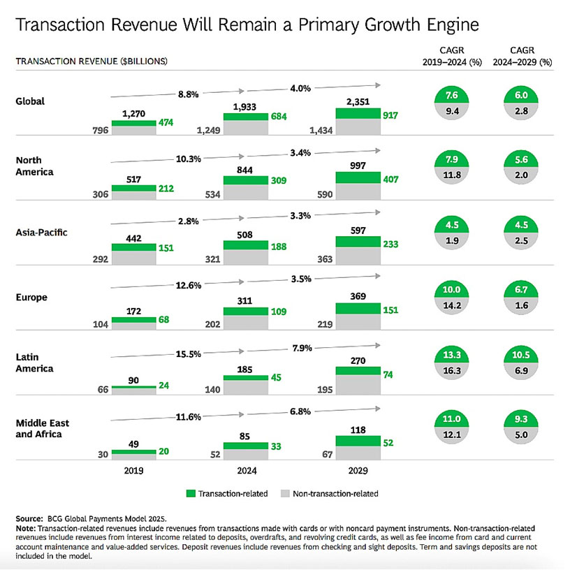 As receitas relacionadas a transações vão crescer 6% ao ano, frente a menos de 3% para a receita não transacional, com o uso de cartões, adoção de pagamentos instantâneos e novos ecossistemas. A América Latina deve liderar com crescimento anual de dois dígitos na receita transacional, de acordo com o BCG.